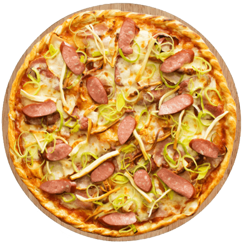Склад: соус BBQ сир Моцарела сир копчений мисливські ковбаски бекон курка копчена цибуля Порей