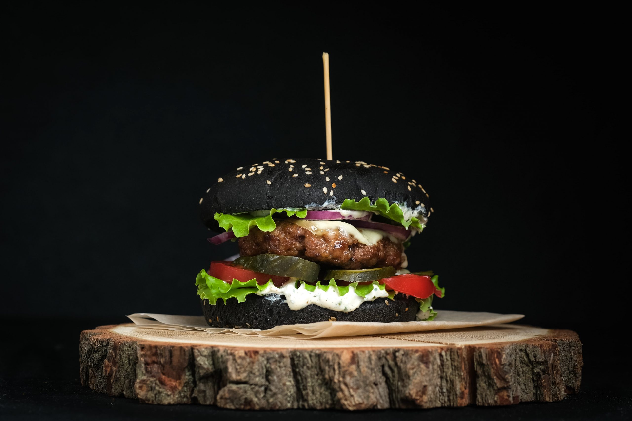Склад: Булочка чорна с кунжутом, соковита яловича котлета, салат, томат, мариновані огірки, маринована кримська цибуля, сир чедер “Данієль”, червоний соус BBQ