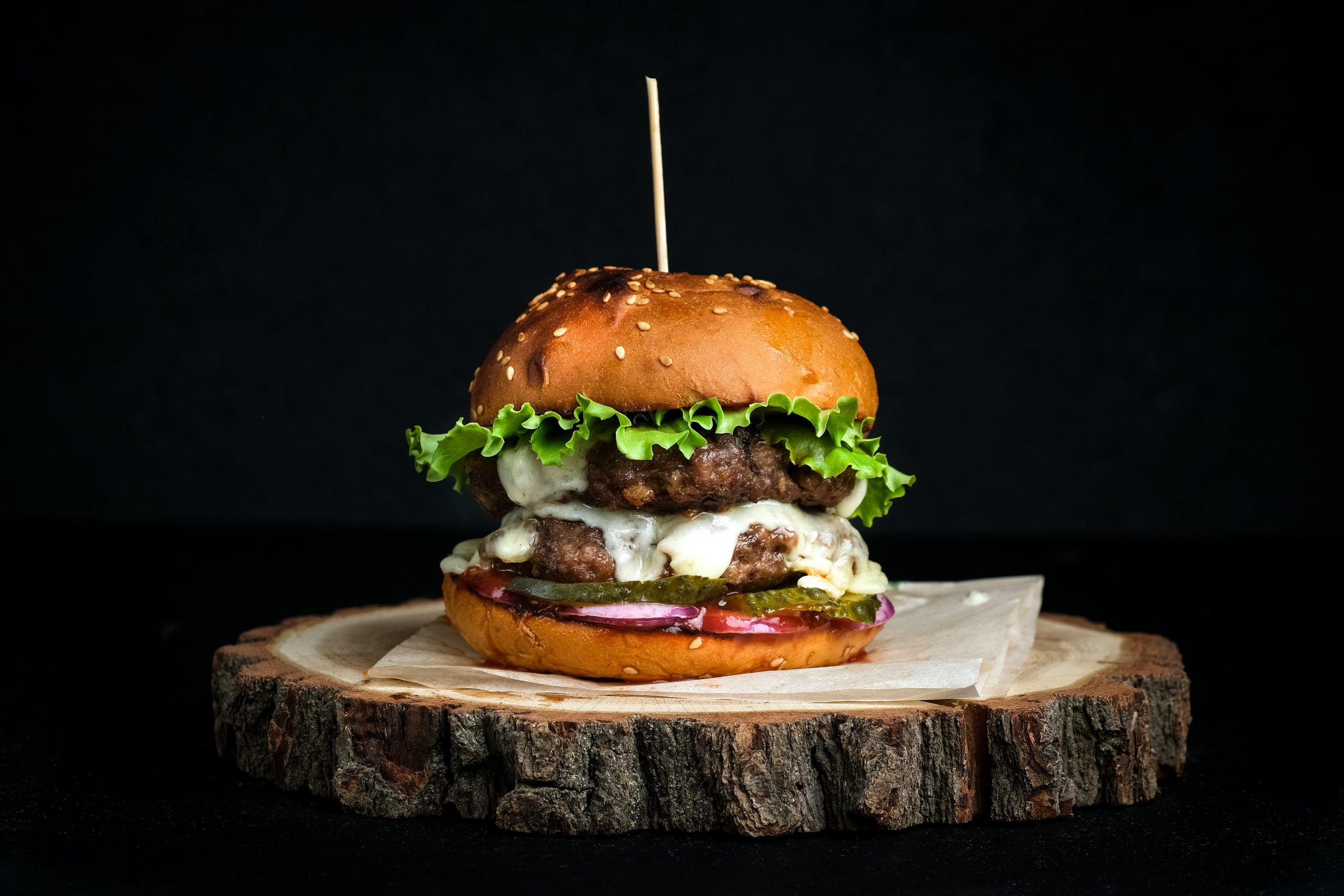 Склад: Булочка Алдея з кунжутом, подвійна соковита яловича котлета, подвійний сир чедер “Данієль”, салат, томат, мариновані огірки, маринована цибуля, червоний соус BBQ, білий соус з кінзою та сванською сіллю