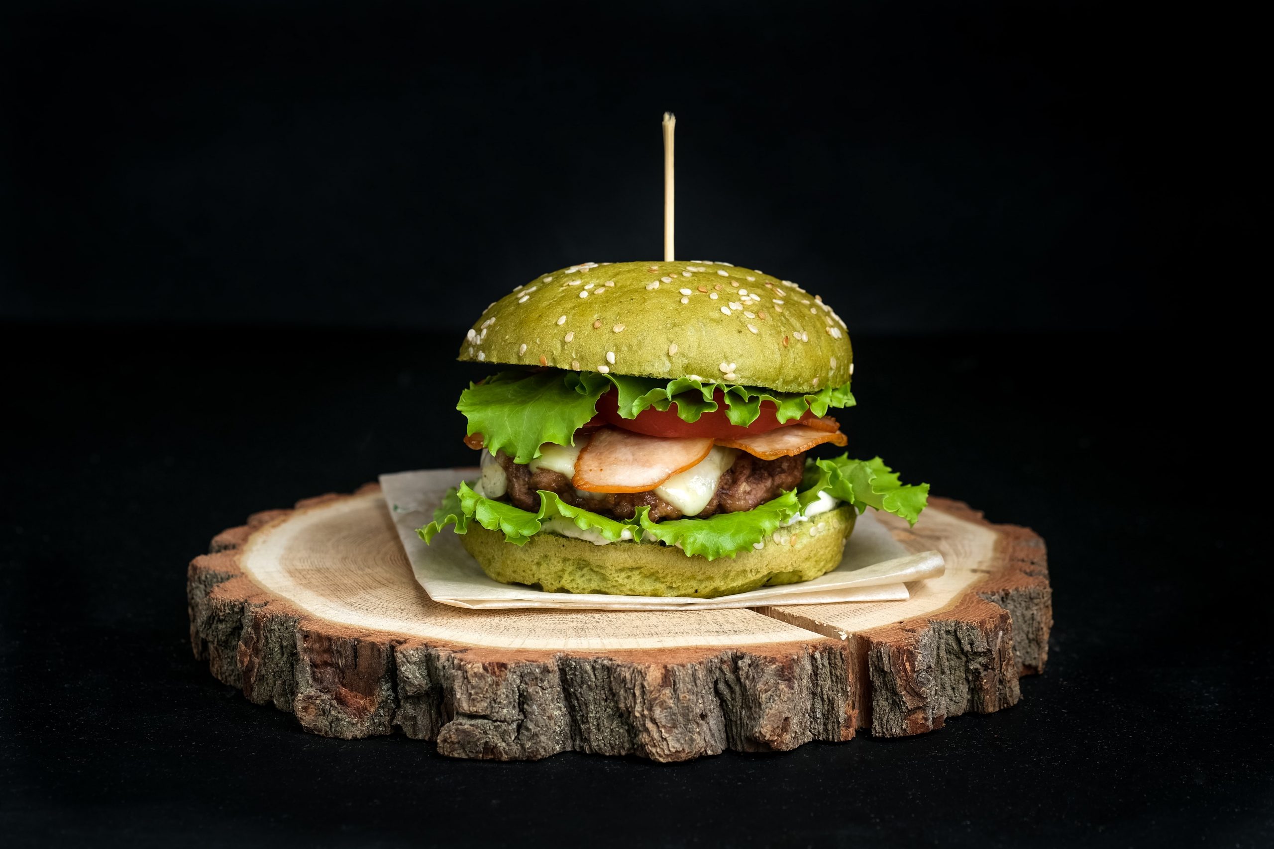 Склад: Булочка шпинатна, соковита куряча котлета, салат, сир чедер “Данієль”, томат, курячі слайси, соус 1000 островів