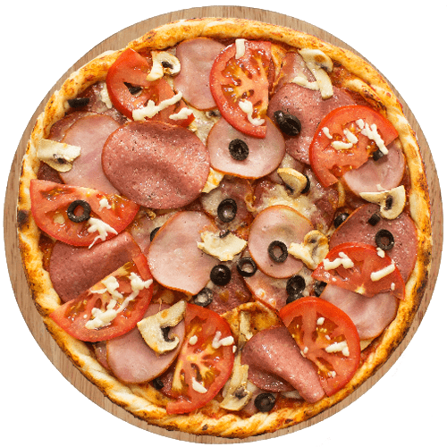 Склад: соус томатний сир Моцарела шинка салямі печериці маслини помідор