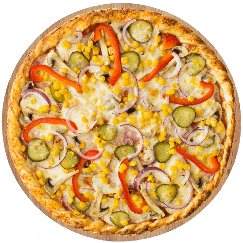 Склад: соус томатний сир Моцарела куряче філе шинка цибуля червона огірки солоні перець болгарський печериці