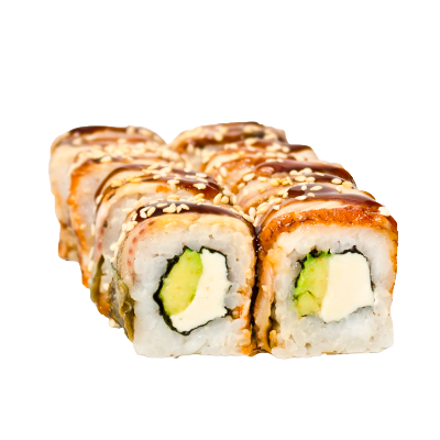 Склад: рис, сир Філадельфія, вугор, соус Унагі, кунжут, огірок, ікра Тобіко