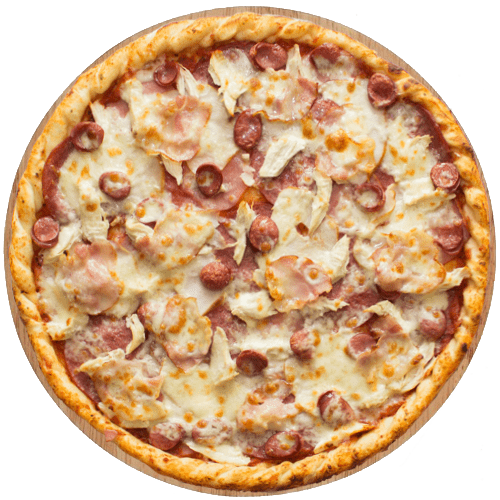 Склад: соус томатний сир Моцарела шинка бекон мисливські ковбаски салямі філе куряче копчене