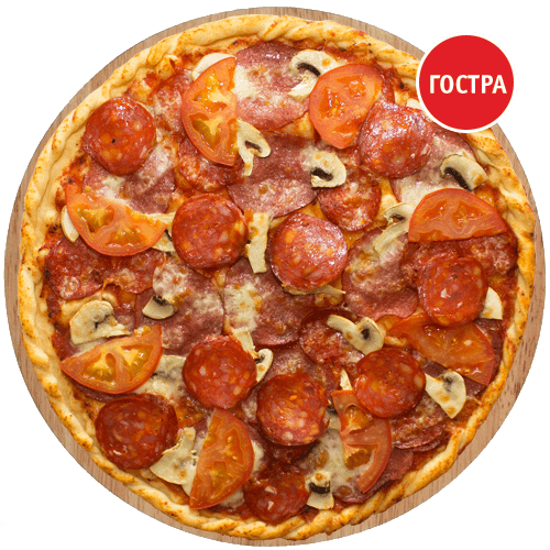 Склад: соус томатний сир Моцарела шинка бекон мисливські ковбаски салямі філе куряче копчене