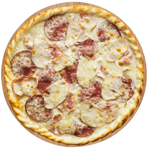 Склад: соус томатний сир Моцарела куряче філе шинка цибуля червона огірки солоні перець болгарський печериці